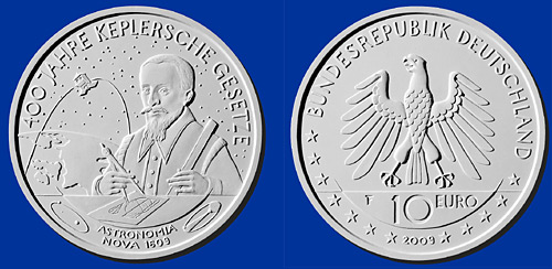 Mimo české pamětní mince připomene 400. výročí formulování Keplerových zákonů také německá stříbrná euromince. Vítězný návrh mince je od Ulricha Böhmea. Stříbrné destieuro vychází 7. května v nákladu 200 000 mincí.